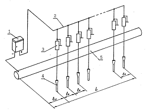 Рис. 2.11 Технология применения анодных заземлителей для целей электрохимической защиты, с равномерным распределением последних на протяжении трубопровода.